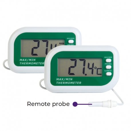 The thermometer features a large, easy to read LCD display, max/min memory function to record the highest and lowest temperatures and a high/low programmable audible alarm. The unit incorporates two temperature sensors, a remote water resistant probe with one metre PVC lead for the appliance temperature and an internal sensor for the room temperature.